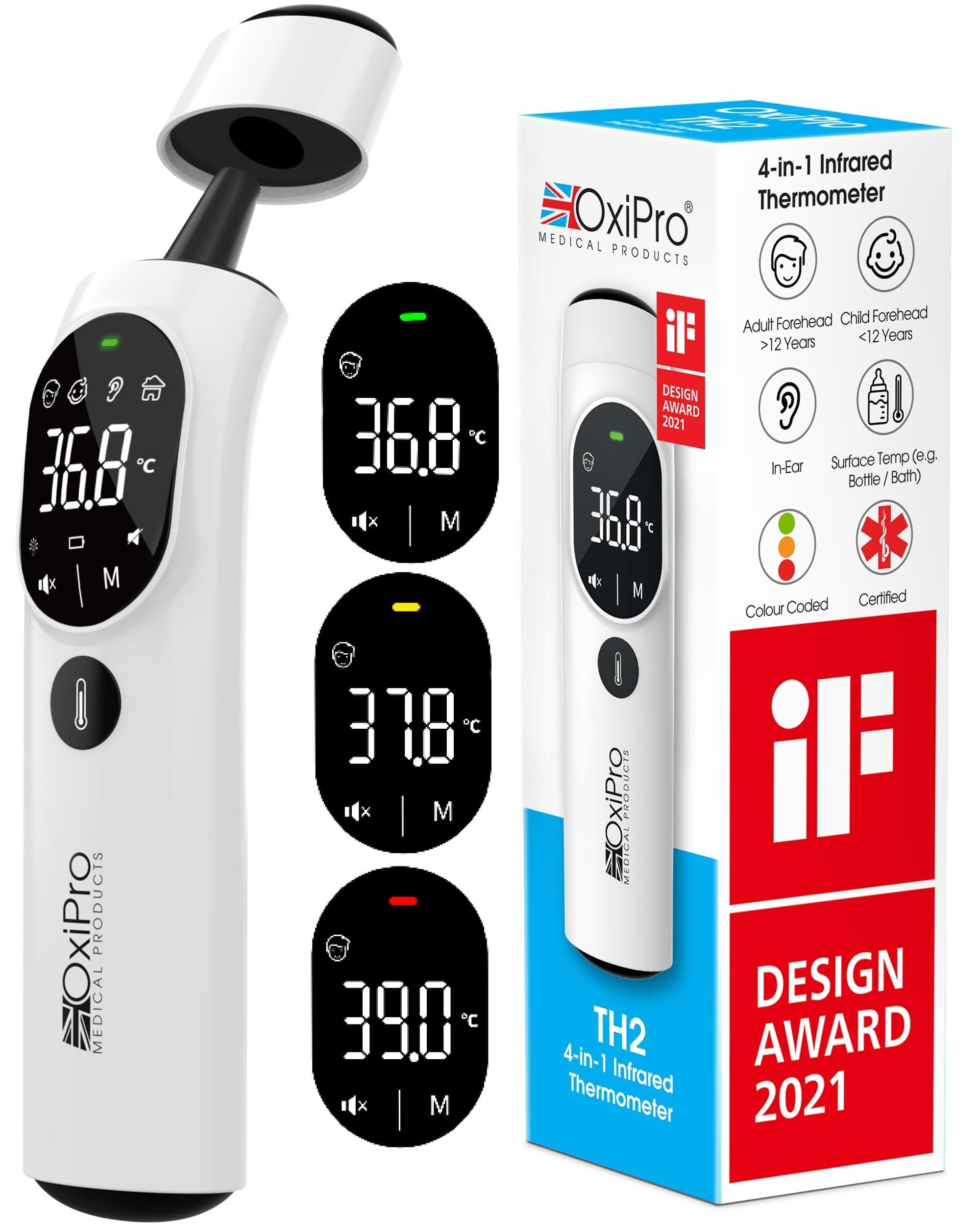 - EAR CANAL LIGHT: The TH2 thermometer is equipped with an LED light by the probe, making it perfect for nighttime monitoring of babies and children, ensuring safe use and accuracy even in low light. Displaying results to 0.1C, the OxiPro TH2 thermometer features clear colour-coded indicators. A green backlight signals a normal temperature, orange for a raised temperature, and red warns of a fever. More than just a digital thermometer for adults and kids, it's a comprehensive health monitor.